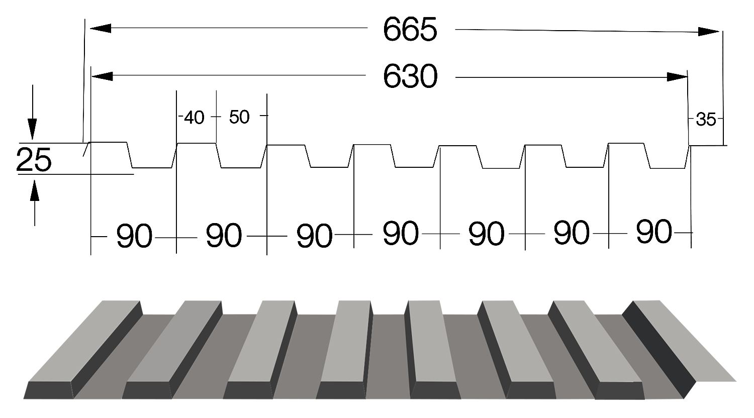• ความกว้างของลอนหลังคาหลังจากหักระยะซ้อนทับแล้ว ไม่เกิน 630 มม.